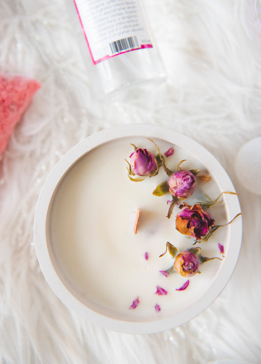 Set "Velvet rose" - lumanare parfumata, apa de trandafir, sare de baie, ceai de trandafir