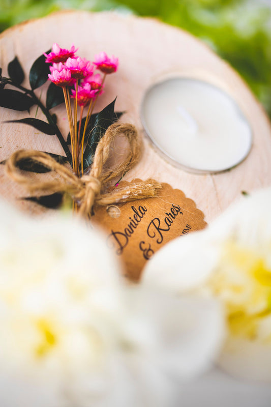 Marturii botez personalizate - felie de lemn cu flori visinii si lumanare parfumata