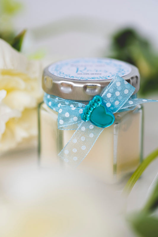 Marturii botez personalizate - lumanare parfumata in borcanel cu fundita albastra