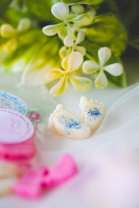 Marturii botez personalizate - picioruse de ceara parfumata cu sclipici albastru