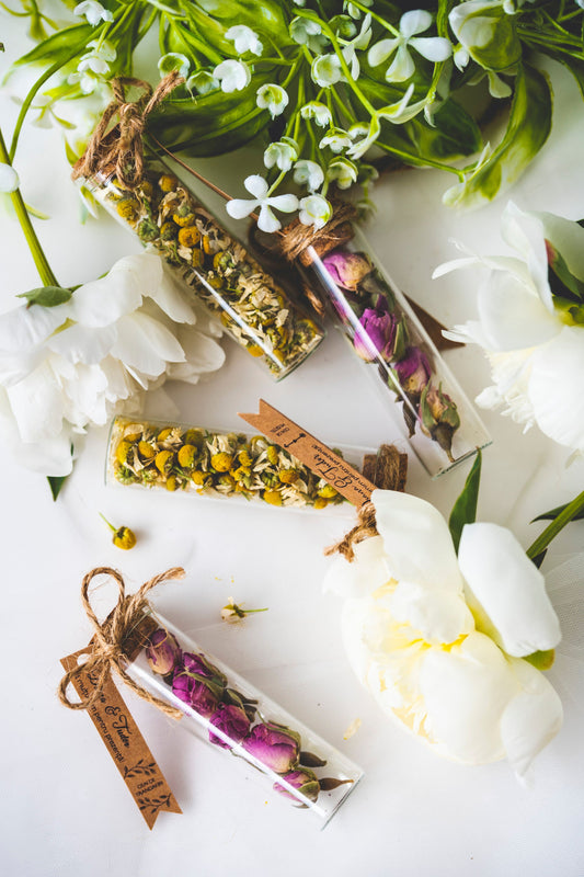 Marturii botez personalizate - sticlute cu flori de musetel dulce, pentru ceai