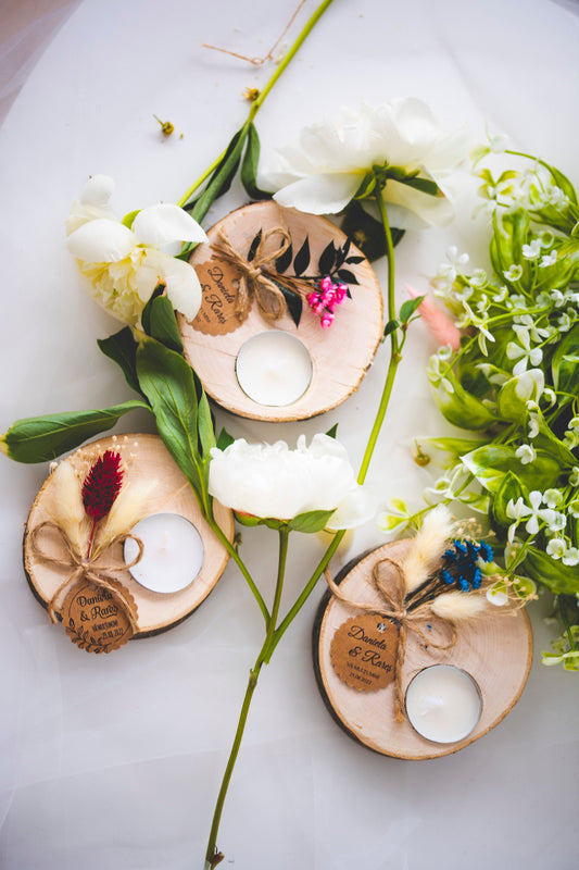 Marturii nunta personalizate - felie de lemn cu flori visinii si lumanare parfumata