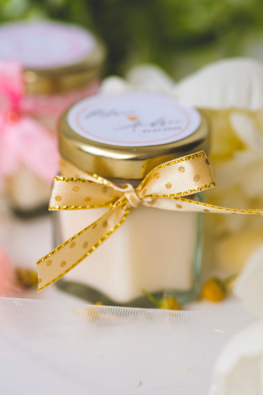 Marturii nunta personalizate - lumanare parfumata in borcanel cu fundita aurie