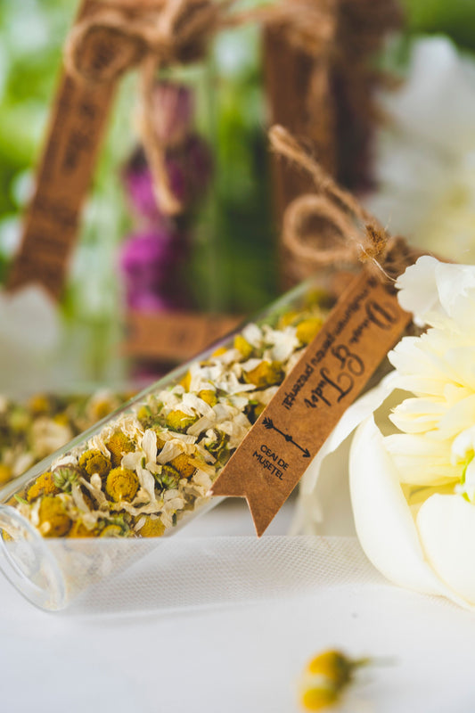 Marturii nunta personalizate - sticlute cu flori de musetel dulce, pentru ceai